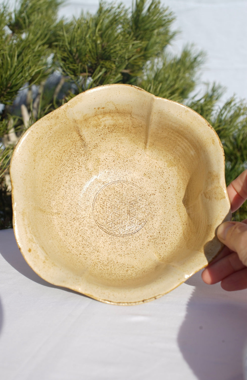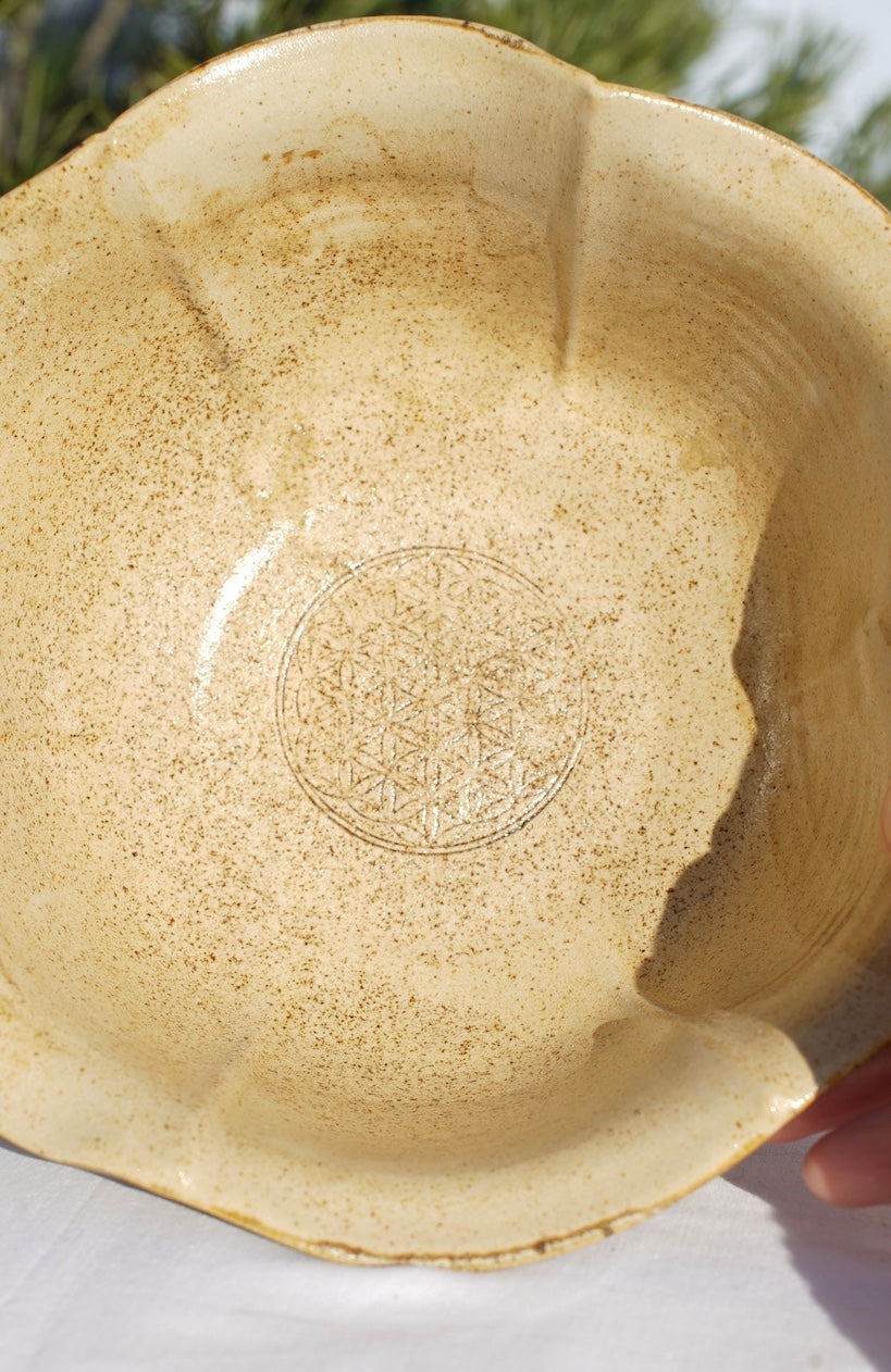 Der Natur so nah. Diese Blüten- Schale wurde von mir in liebevoller Handarbeit erst an der Töpferscheibe gedreht und später per Hand die Blütenform herausgearbeitet. Im Inneren ist die Blume des Lebens. Durch die eingebrachte Agnihotra-Asche, ist ein Genuss daraus zu essen. Die Agnihotraasche ist im Ton und auch in der Glasur enthalten. Die Ascheglasur enthält keine chemischen Nebenstoffe und ist damit vollkommen natürlich. Diese Asche verändert die Kristalle der Getränke in der Schale hin zu lebendigen hexagonalen Strukturen  (erstmals nachgewiesen durch Masaru Emoto) und macht sie so für den Körper besser verwertbar. Die Asche soll sogar dazu beitragen Schadstoffe durch Umwandlung zu neutralisieren.